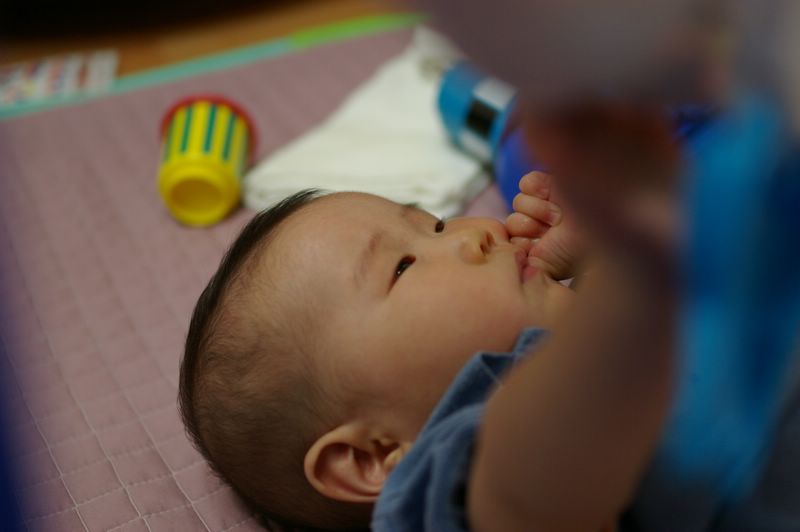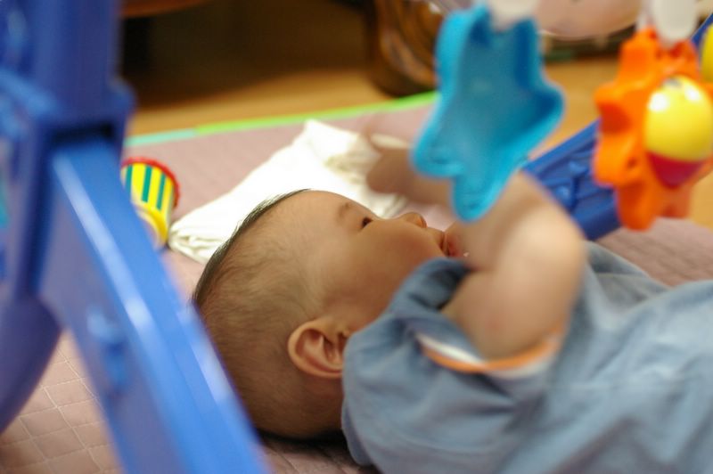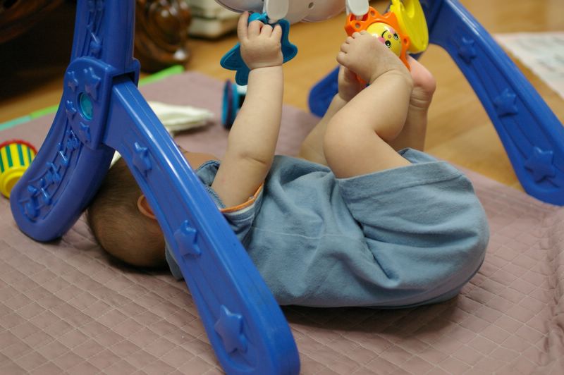 아기체육관을 처음에는 발로 가지고 놀더니 이제는 손발을 같이 가지고 논다.