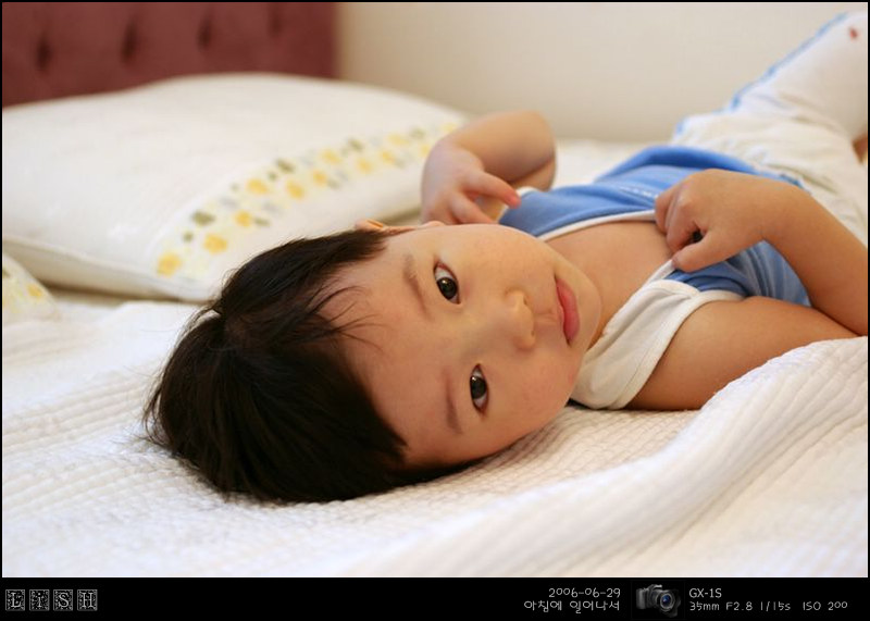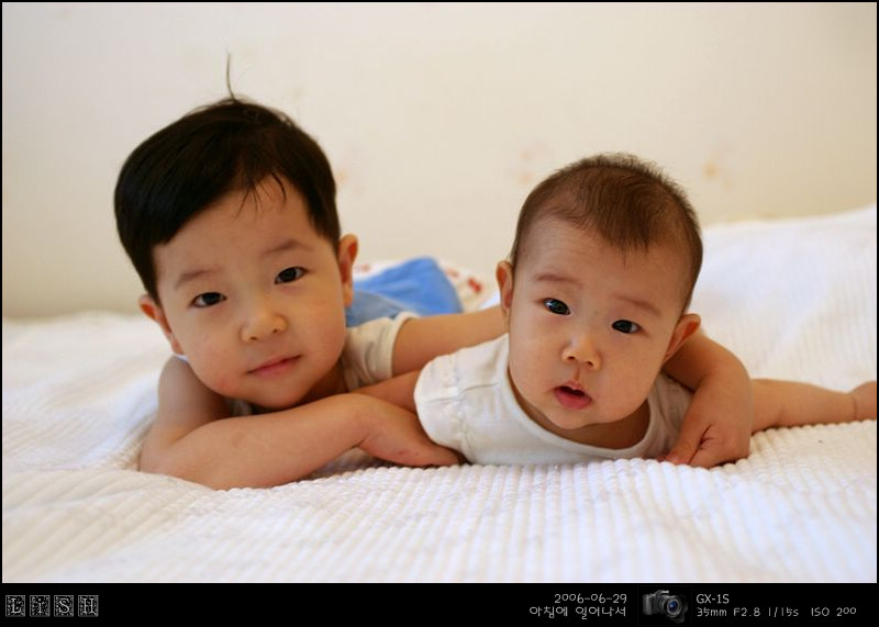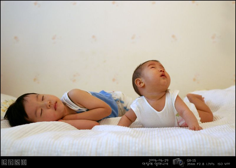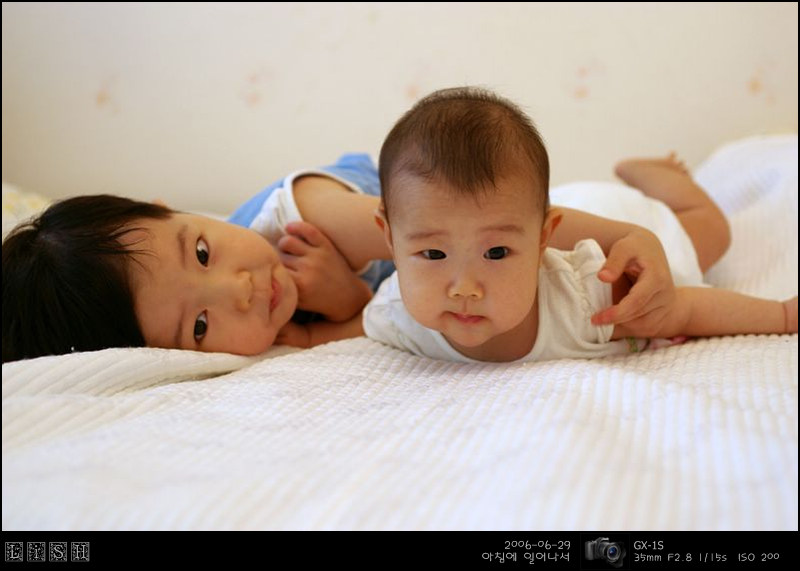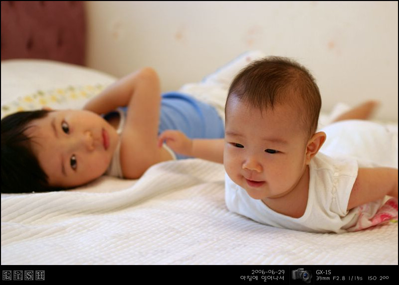아침에 소윤이가 일찍 일어났기에 둘 다 침대에 놔두고 한 번 찍어봤다.