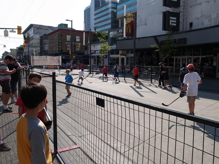 캐나다는 해가 9시반정도 되어야 저물기 시작합니다. 그래서 낮시간이 참 길어요. 도서관 끝나고 나서 책도 좀 보고 나왔는데 그랜빌스트리트와 랍슨 스트리트가 만나는 부근의 차도를 막아서 행사를 하고 있어서 구경중입니다. 주말에는 거의 이런 거리 행사가 있다고 합니다. 오늘은 거리의 한쪽을 막아놓고 이렇게 하키 경기를 하네요.