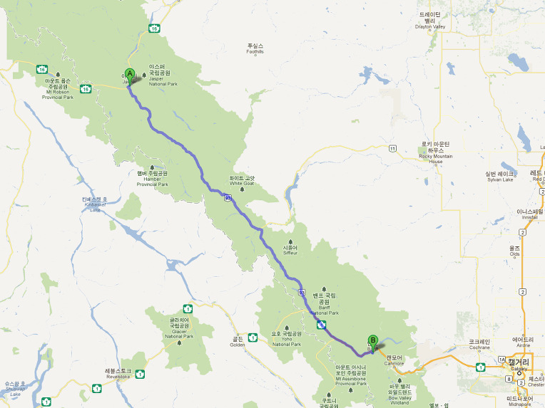 보통 ‘캐나디안록키행’ 하면 야스퍼 국립공원과 밴프국립공원을 얘기하는데 아래 지도에서 A가 야스퍼(Jasper, 현지에서는 그냥 재스퍼로 발음합니다) B가 밴프(Banff)입니다. A에서 B로 여행하기도 하고 B에서 A로 여행하기도 하는데 보통은 B에서 A가 많은 것 같습니다. 저희는 A에서 B로 갔습니다. AB간에는 Icefields Parkway라는 고속도로가 있어서 이 길을 오가면서 이 길의 주변에 있는 관광지들을 둘러보는 형식으로 여행이 진행됩니다.