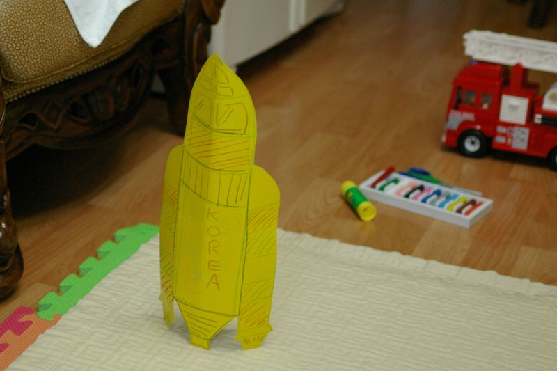 상윤이 미사일 By lbnkorea | 2006-07-22 0 Comment 백과사전책에 있는 미사일을 만들어달라고 해서 만들어줬다. 그림책에 USA로 써있어서 KOREA로 바꿨더니 글자가 틀리다고 하는거 우리나라니까 이렇게 써야한다고 설득하느라 애먹었다. 몇일은 잘 가지고 놀았다.