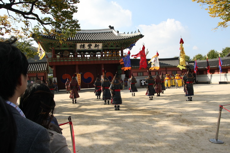 행궁앞에서 무예시범을 한다고 해서 기다리는 중입니다.