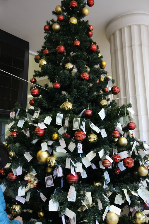 산타에게 Wish-card 써서 붙이는 트리