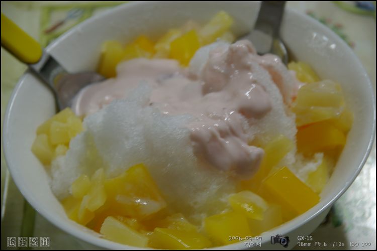 아빠가 개발한 요구르트빙수 By lbnkorea | 2006-09-09 0 Comment 원래는 팥이 다 떨어져서 그냥 후르츠칵테일만 넣어서 만들어먹는데 마침 상윤이 요구르트 사놓은 게 있어서 딸기요구르트를 하나 넣어봤더니 이게 작품이다. 보기에는 어떨지 모르겠지만 맛은 제법이다. 한동안 애용할 것 같다.